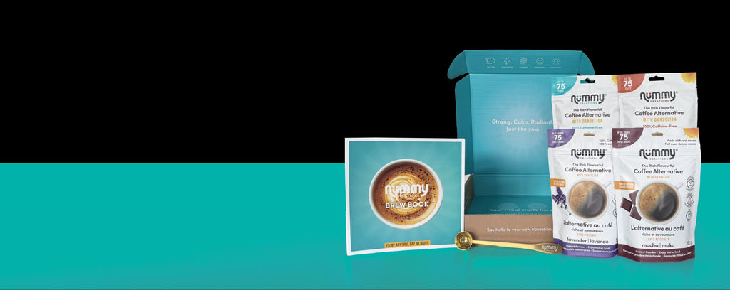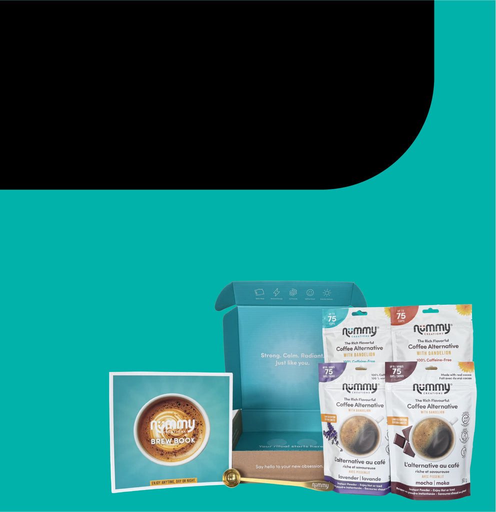 Nummy Creations® is a rich, herbal co ee substitute made with the roasted extracts of dandelion root, chicory root, barley and rye - all carefully selected to support your body, not stress it.